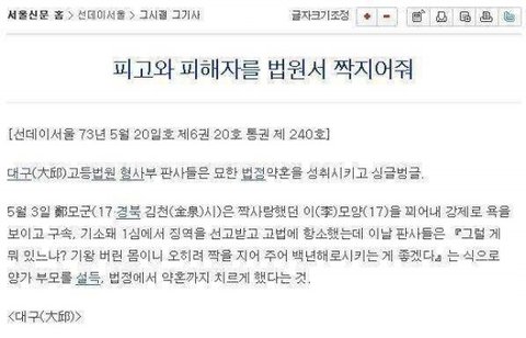 기왕버린몸????미친것들.....저시대에 어린여학생이 신고하는것 자체도 많이 힘든일이였을텐데.... 어쩜 저딴 그지같은 판결을 하지 피해자 부모도 똑같네 딸내미 인생은 신경도 안쓰겠다는건가?