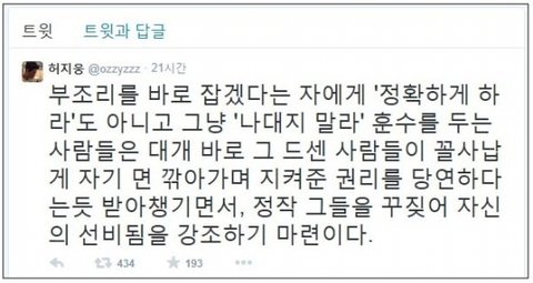 부조리라는 단어를 허지웅 입에서 들으니 좀 그렇네.. 비행기에서 담배피는 건 조리있는 행동인가.. 법적으로 하지말라는 짓을 그렇게 했던 사람이.. 나서서 김부선 지지해준건 고맙다만 너도 니 예전 행동을 안다면 함부로 막 나서진 않아야할텐데.. 하지마라는 행동해놓고 다른 사람이 하지말아야할 행동을 했다고 공개적으로 일침 놓는건 나는 되고 누군 안되는 뭐 이런 마인드인가? 개허세..자신부터도 좀 돌아보길..여기저기 일침놓고다니며 옳은 사람인 척 그만하고..