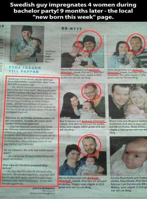 스웨덴의 한 남자가 친구 총각파티에 가서 하룻밤에 여자 넷을 임신시킴. 9개월 후 지역 신문 "이번주에 태어난 아기" 코너에 네 번 등장