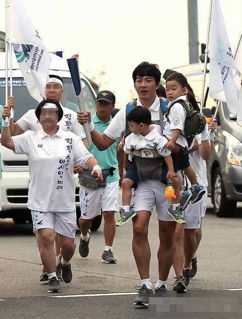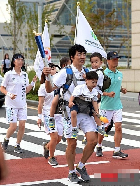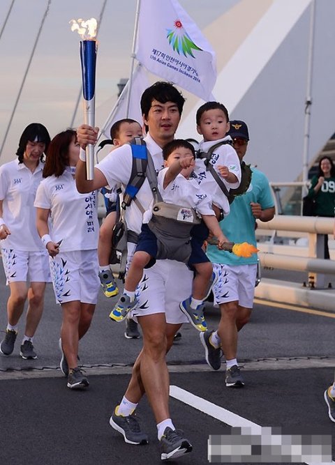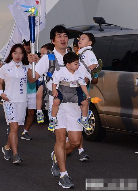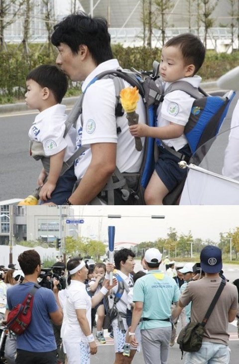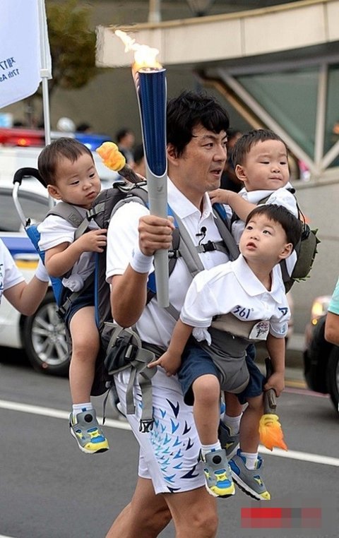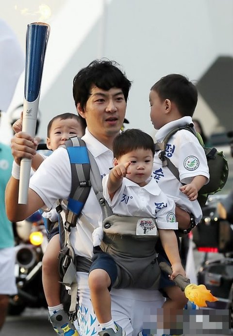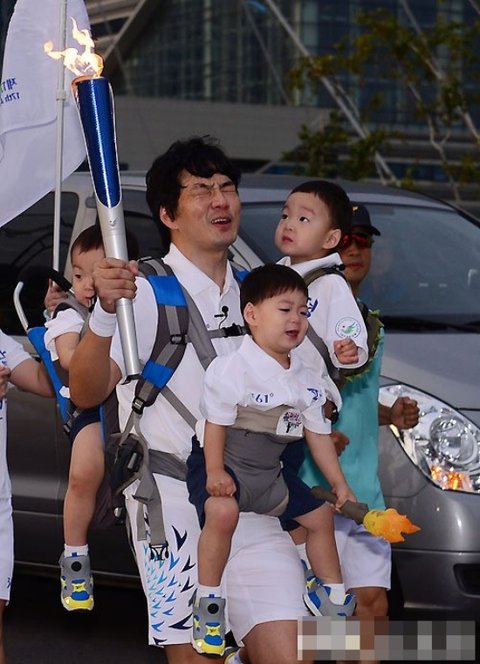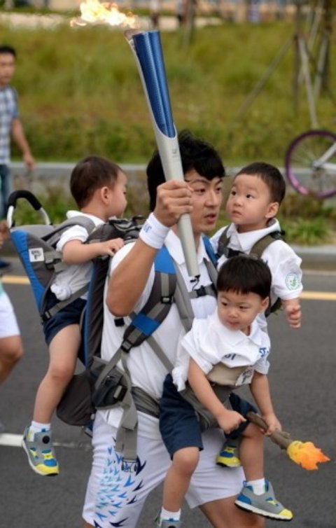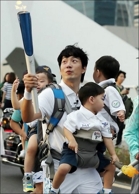역시 어딜가나 붙어있는 삼둥이들을 안고 힘든표정으로 성화봉송을