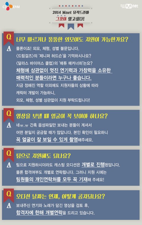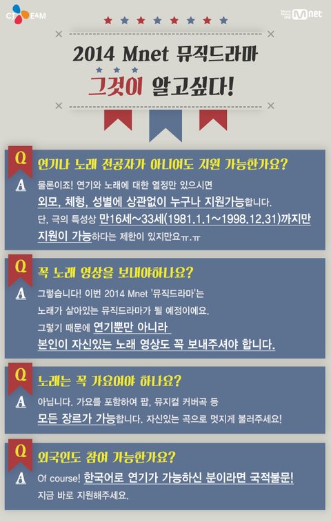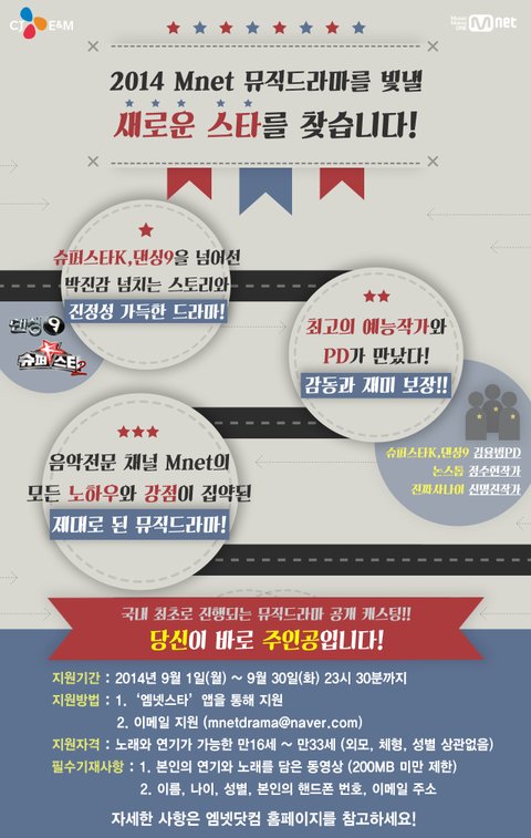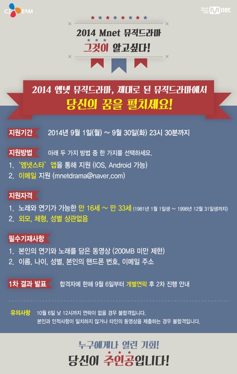 ★ 2014 Mnet 뮤직드라마 연기자 공개 모집 ★ 대한민국 대표 음악채널 엠넷의 제대로 된 ‘진짜’ 뮤직드라마에 도전하라! 지금까지의 뮤직드라마는 잊어라! 이것이 ‘진짜’ 뮤직드라마다!