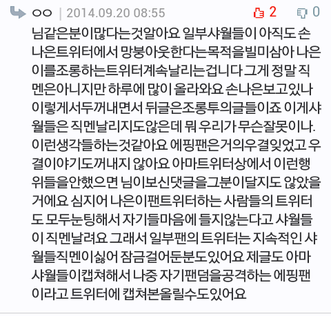 그럼 손나은 한테 망붕짓좀 작작 하라 하던가 그리고 니네가 먼저 태민한테 남창 드립 게이 같이 생겼다 뭐다 하면서 했지 않냐 지들 불리 할때마다 반대 쳐누르더라