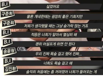 처음엔 B.I랑 구준회가 너무 직설적이게 말하고 새로온애들 싫어하는걸 너무 적나라하게 드러내는것같아서 새연습생들 좀 불쌍하고 그랬는데