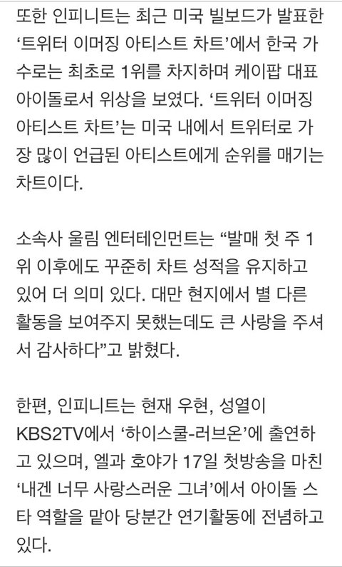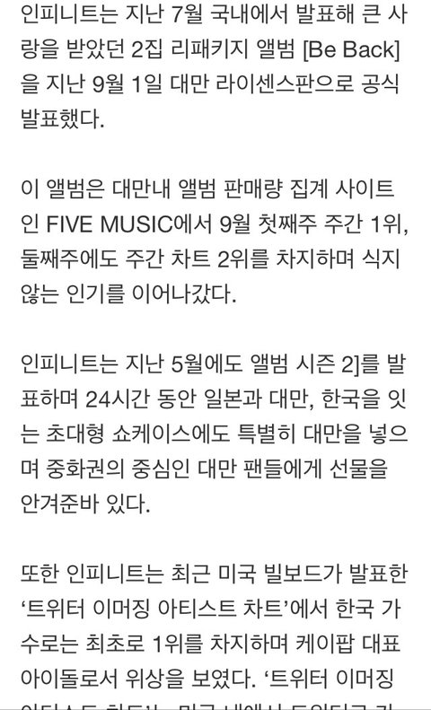 정말 점점 해외팬들도 더 많이늘고 요즘보면 너무 뿌듯하고 부심든다ㅎㅎ물론 국내에서도 인기많지만 외국사는 인슾말에의하면 인피니트 인기진짜 쩐다면서 부심가지라함!빌보드 어메이징차트 1위도라스트로미오로 최근거머쥐고 해외로 더욱더 영향력잇는 가수라는걸 증명하는거같아서 정말 인부심 듬 ㅠㅠ믿고듣는 인피니트 화이팅❤️