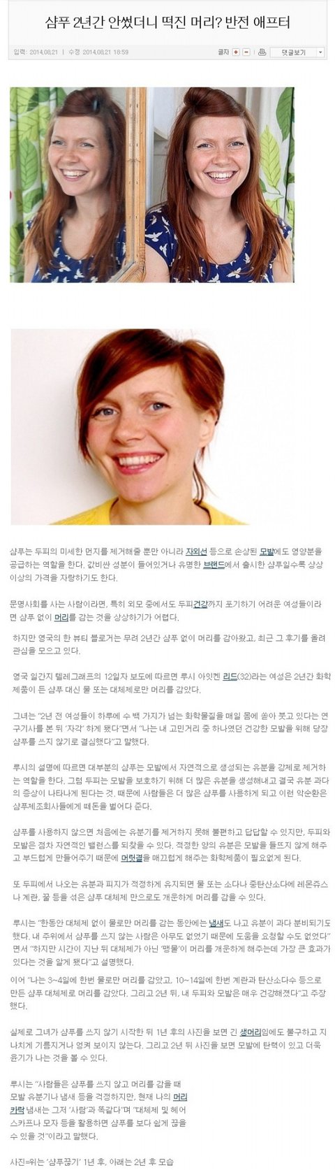 2년간 샴푸 없이 머리를 감은 여자
