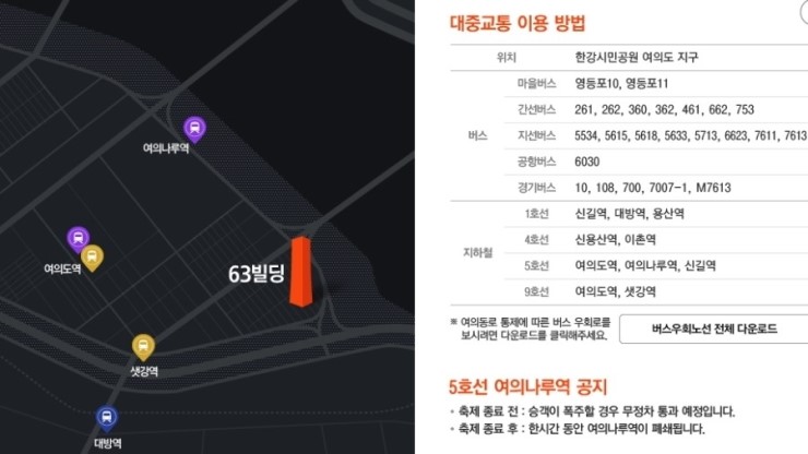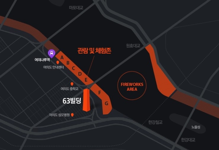 가장 좋은 여의도 불꽃축제 자리는 63빌딩 앞에 마련된 잔디마당 입니다.