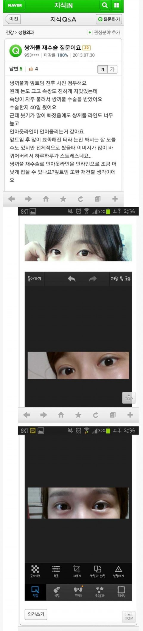 40일밖에 안됐으니까 그렇지 뭐가 안타까워... 붓기 다 가라앉고 나서 얘기해도 안 늦음. 그리고 글에는 앞트임 했다고 했는데 앞트임 안한거 같은데? 앞트임 하고도 40일만에 흉터가 저렇게 하나도 없이 아물었다면 저 사람은 진짜 신이 내린 사람임... 앞트임 흉터 엄청 잘남는데 어떻게 저렇게 깨끗하게 됐지.. 나도 그 의느님 좀 알고 싶다 가서 수술받게..
