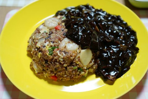밥을 새우넣고 마늘 넣고 맛난 볶음밥으로 해서 짜장을 올렸어요.