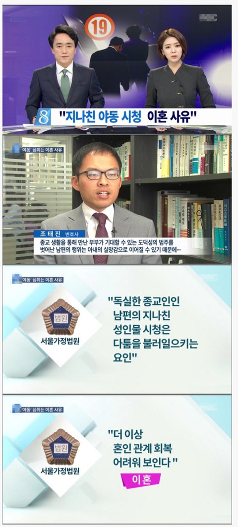 이 이혼소송의 주된취지중 하나는 부인과 잠자리를 촬영한것이 인터넷에 유포됐다는것입니다 단지 야동 때문에 이혼사유가된것은아닙니다 야동을자주본다고 이혼사유가되는것이아니고 그러한이유로 부부관계를 하지않는다던가 해야 이혼사유에 해당덥니다