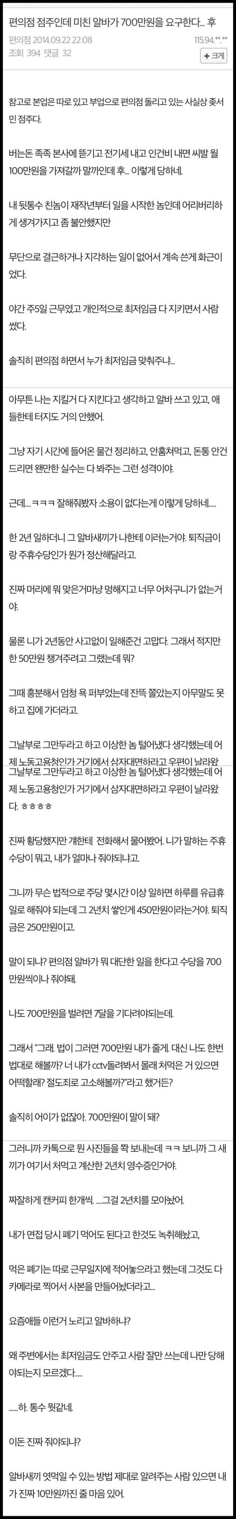 너네들이 다 사장을 욕해도 본인이 사장이면 억울할걸? 노동법같은거 다 지키면서 사람쓰는 편의점이 없으니까 사장이 억울하겠지. 솔직히 어떤 점주가 법을 꿰고 앉아서 사람고용하겠나. 나는 국가가 법을 만들었으면 제대로 홍보하고 알리고 지키라고했으면좋겠다. 솔직히 위생법 위반안하는 식당없다. 주인들이 나뻐서 그러는게 아니고 위생법기준이 뭔지도 모르기때문이야.