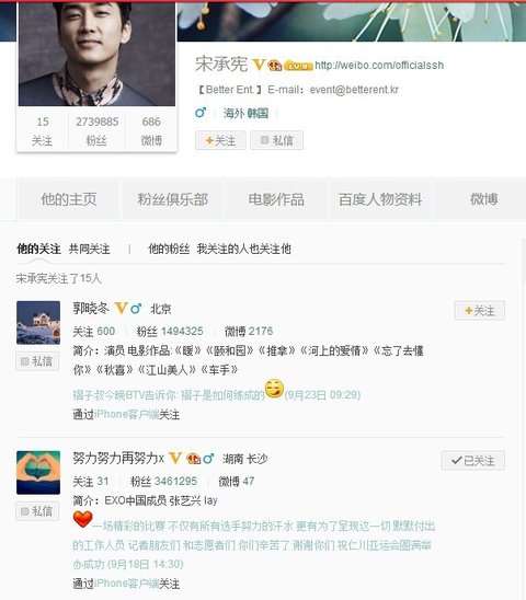 씽이랑 송승헌이랑 웨이보 맞팔했어요~