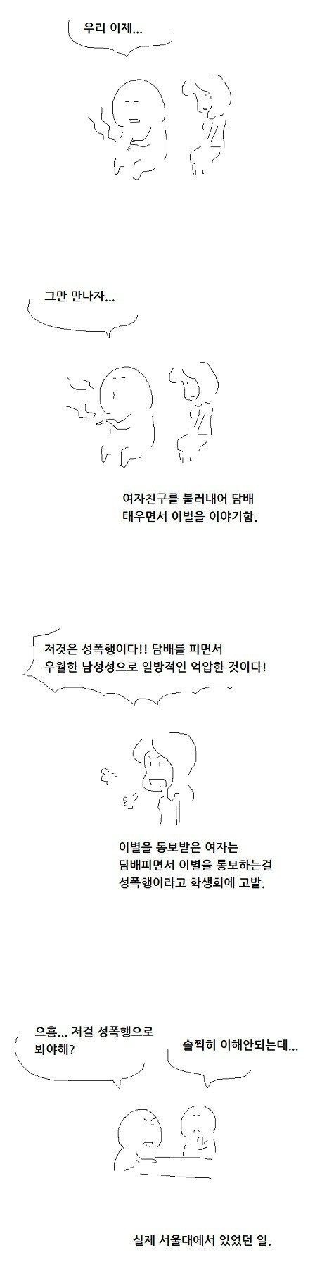 이거 실제로 일어난 일.. 요약하면 저 년이 고발한 후 당시에 서울대 사회대 학생회장이었던 유시민 딸이 성폭력 아니라고 신고를 반려 -> 그러자 저 년이 꼴페미들과 유씨(유시민 딸)를 비난하기 시작 -> 유씨가 저 남자에게 사과하게 했지만, 인간적 사과가 없었다고 계속 비난 -> 결국 유씨는 폭언과 스트레스에 시달리다가 학생회장직을 사퇴함 한국 최고 지성인들이 모여있다는 서울대에서 일어난 개 ㅄ같은 사건