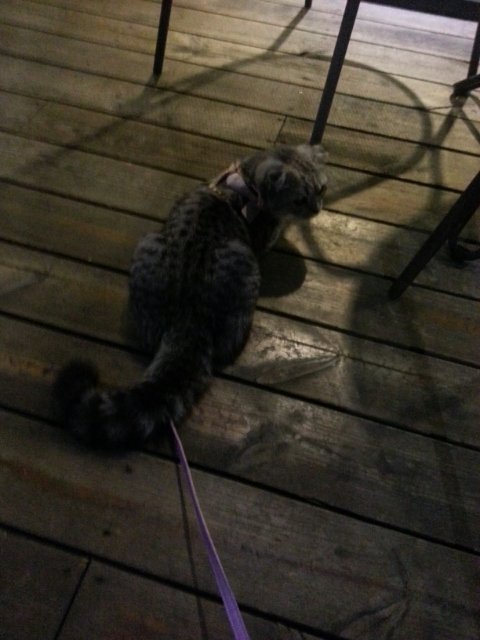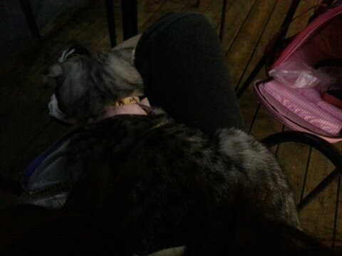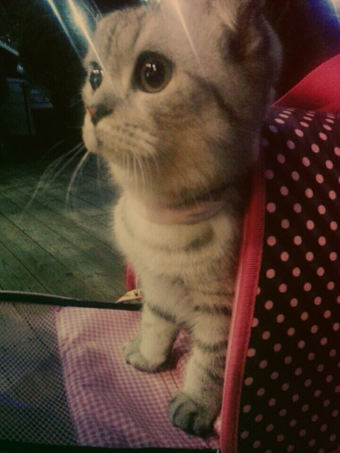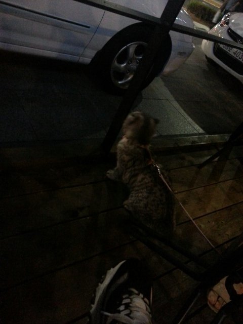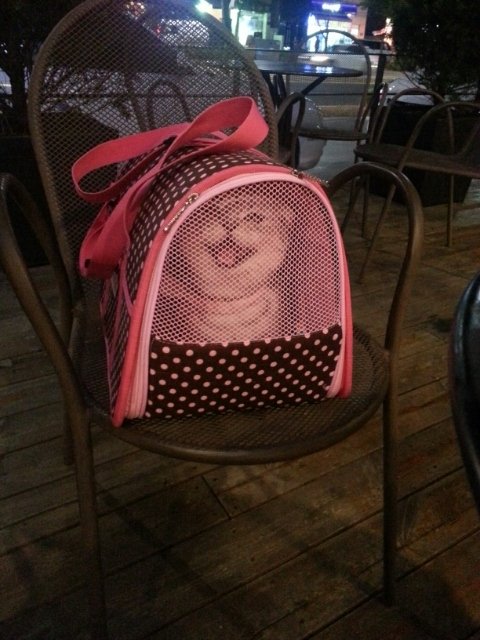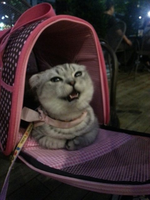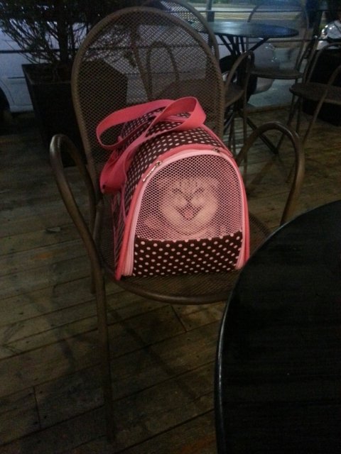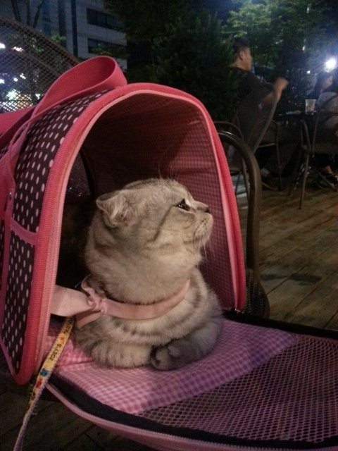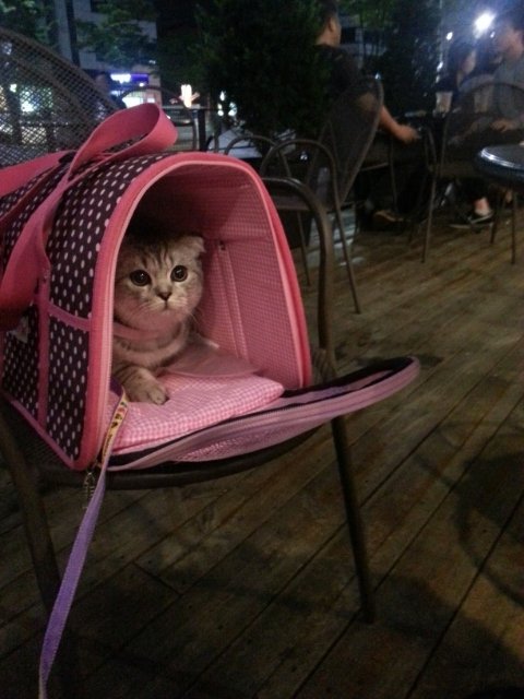 리오를 이동장에 넣어서 카페 테라스에 데리고 왔어요!