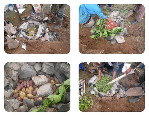 전통식 빠차망까를 만들 때 감자의 원산인 Peru에서 빠질 수 없는 감자와 고구마가 자연 솥바닥을 채우고 있다.