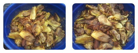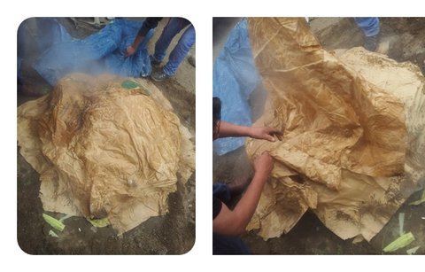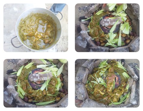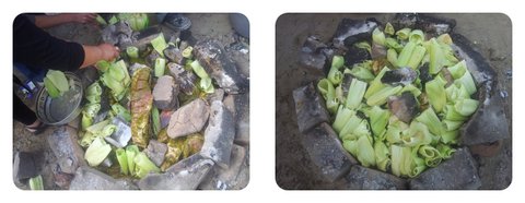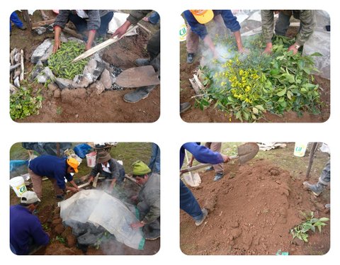연기가 안 새나가도록 단속을 하고 나서 최종작업으로 위에 흙을 덮으면 더 이상 사람의 손이 필요없이 내부에서 서서히 음식이 익어간다.