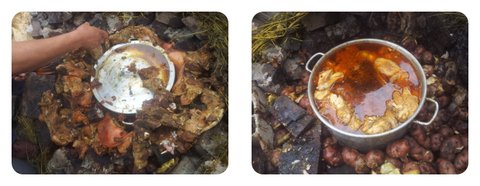 조리과정에 아마 양념만큼 흙도 묻어나지 않을까 우려되는 이방인의 시선과 상관없이 그들은 전통방식으로 잰 고기를 돌 속에 집어넣고 있다.