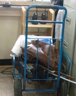 ▲ A양의 시신을 옮길때 이용했던 수레와 여행가방, 폭행할때 이용한 목검