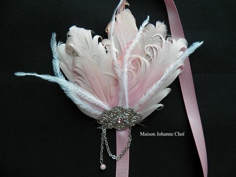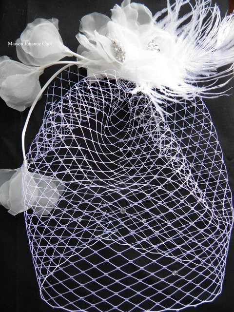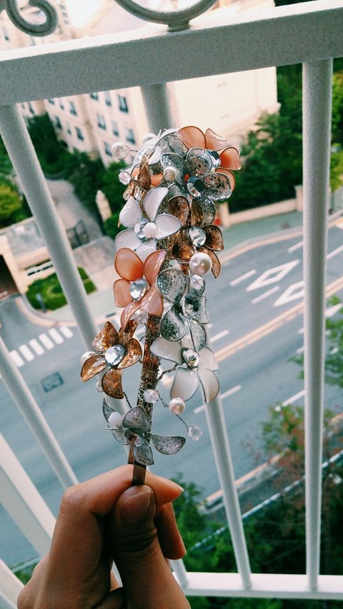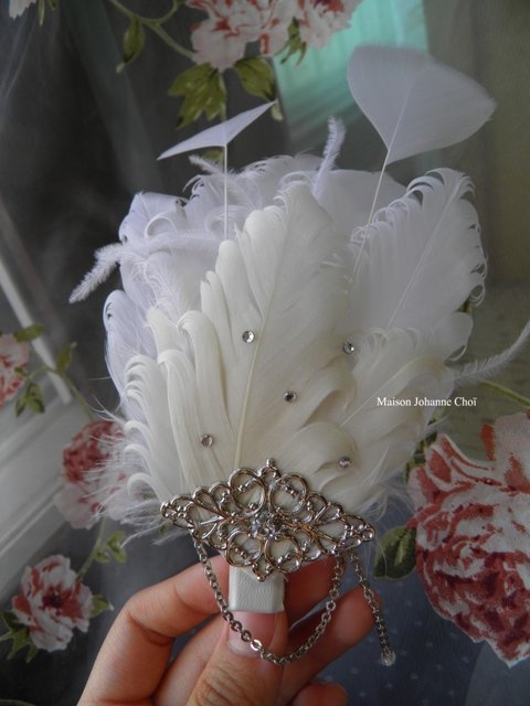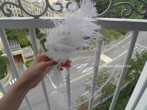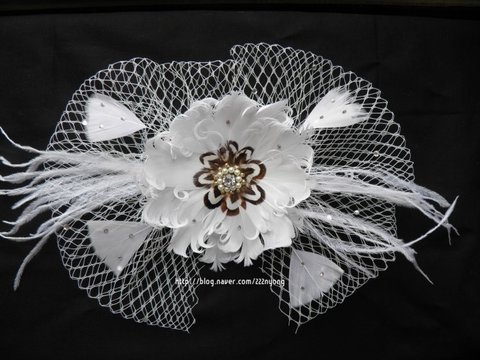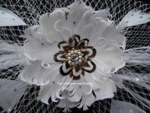 기러기털로 꽃모양 만들고 큐빅이랑 망사로 장식했어요