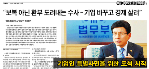 문제는 이렇게 자신이 있게 특별사면 제한을 주장했던 박근혜 대통령이 순방 중에 황교안 법무부 장관의 입을 빌리고, 언론의 힘을 얻어 '기업인 특별사면'을 추진하려는 작업을 하고 있다는 부분입니다.