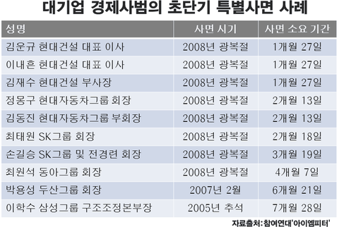 정몽규 현대자동차그룹 회장과 김동진 현대자동차그룹 부회장은 2개월 13일 만에 최태원 SK그룹 회장은 2개월 18일 만에 특별사면을 받았습니다.