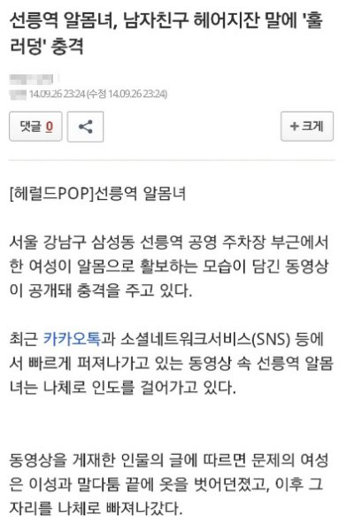 동영상 봤는데 차안에서 창문내리고 이거 찍은 거 같은데 촬영남: 헐... 옆에녀: 아~ 흥분했나봐!! 촬영남: 허! 대봐아아아아아악!!! 죵나 눈꼴시려웠네. 옆에 년 진짜 같은 여자로서 일말의 동정심도 없냐. 흥분했나봐가 뭐야 흥분했나봐가 ㅋㅋㅋㅋㅋㅋ 진짜 소름끼치네 이년 신상 털어버리고 싶을 정도였음. 남잔데 여자 알몸봐서 좋은게 아니라 진짜 불쌍하더라. 가려주는사람 아무도없고...