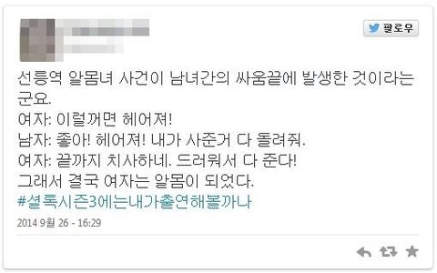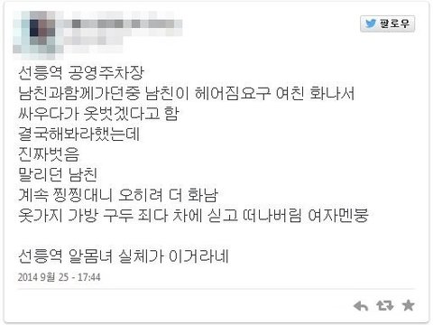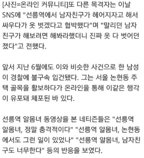 사진으로 만든 동영상 봤는데... 여자도 미친년. 남친도 미친놈. 지나가는 행인들도 다 미친사람들 같아... 오토바이세우고, 차 창문 내리고 대놓고 사진찍기 바쁜 미친 사람들... 같은 여자들도 도와주는 사람이 하나도 없네...하... 미친 사회다.