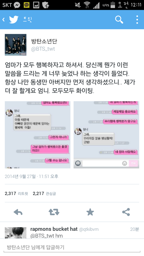 오늘 남준이 트윗을 보니까 정말 남준이는 멘탈이 갑 인거같다 그래서 엄마한테 잘 해야겠다는 생각도 많이 들었다
