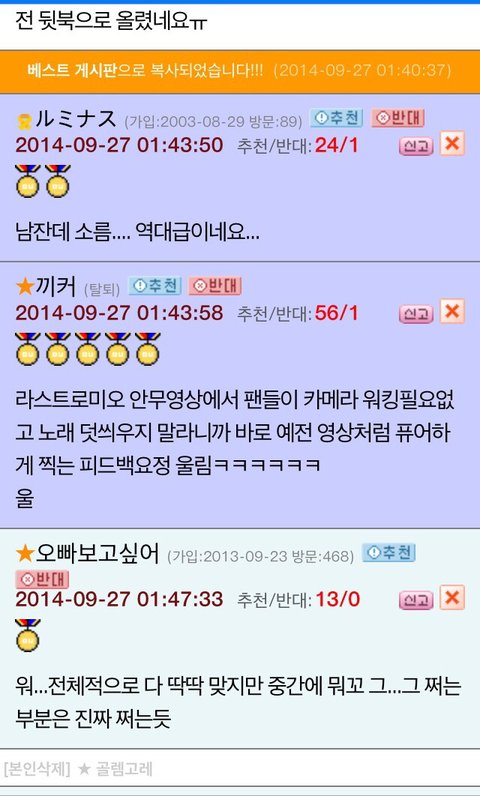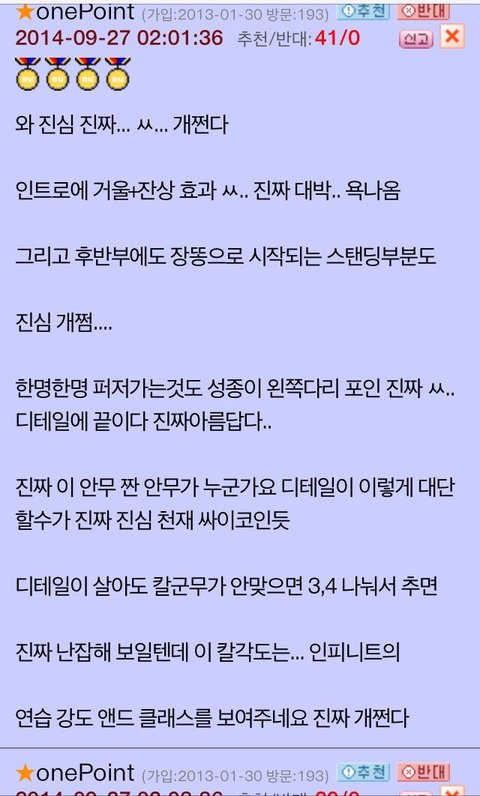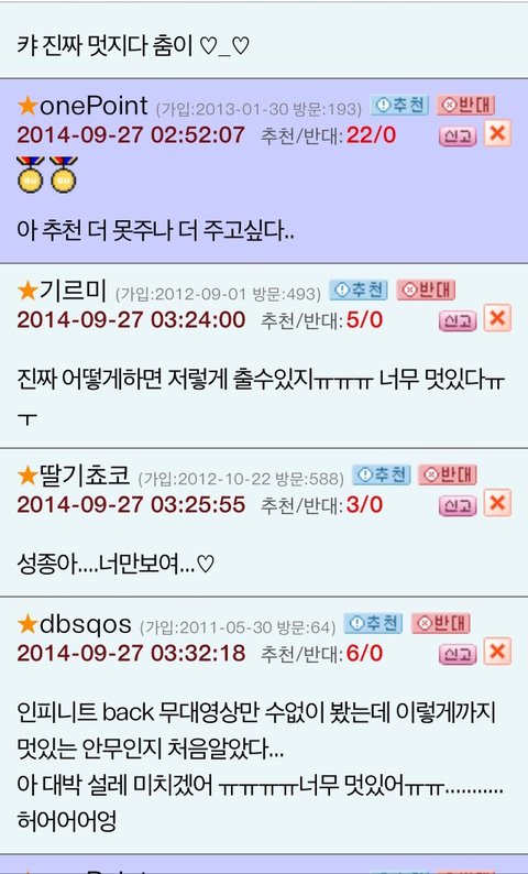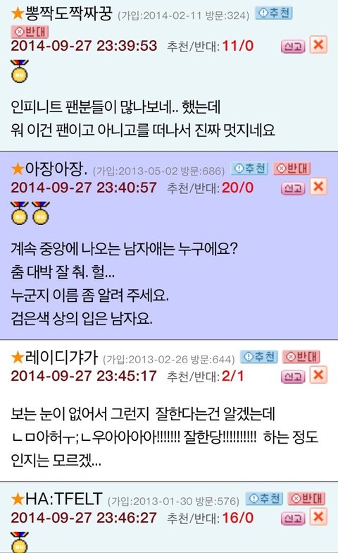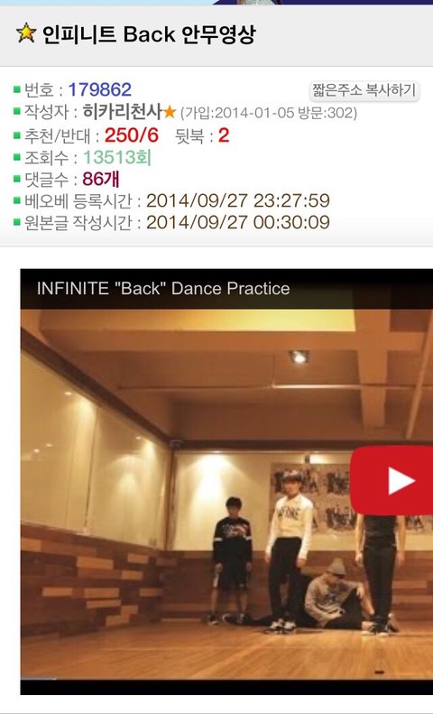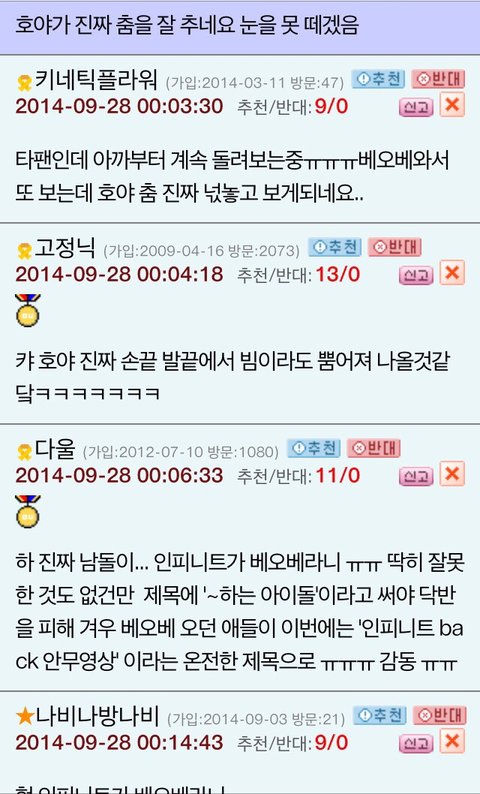 네이트판이 여성사이트라면 오늘의유머라는 남자들 주로하는사이트에서 베스트글 잉피back안무영상글이됫나봄 ㅜ근데댓글진짜호평쩔고 훈훈함..뿌듯뿌듯ㅜ인부심ㅠㅠ진짜 안무영상은 언제봐도쩌는듯..얼마안된인슾이라 인피니트하면 칼군무라고하는거 잘몰랏는데 라스트로미오 안무영상보면서 진짜와 이래서 인피니트하면 칼군무구나 느낌..back도역시나기대를 저버리지않음..항상노력이 돋보이는 인피니트 화이팅!!
