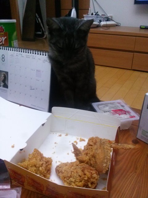 치킨을 자주 시켜 먹는데 먹지 말라고 하니까 저렇게 올라와서 집사 한번 째려 보고 치킨 한번