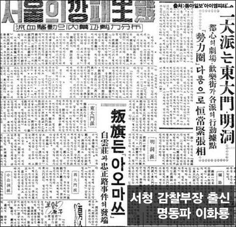 명동파 이화룡은 평양 출신으로 서청 감찰부장을 지냈고, 제주도 공비토벌에 종사하다가 명동파의 두목이 된 사람입니다. 이화룡 밑으로 서청 출신들이 대거 유입되기도 했는데, 이들의 폭력성은 거의 테러 수준이었습니다.