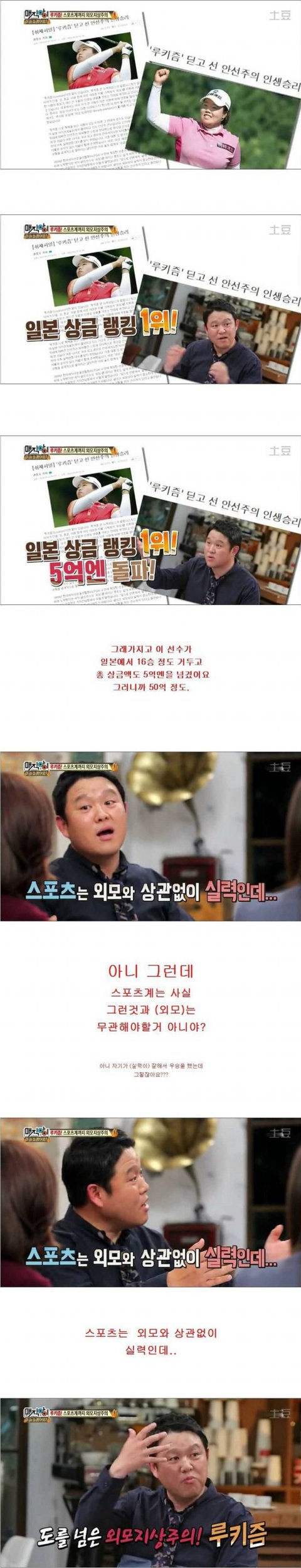 외모우월한걸 좋아하는건 미개한게 아니지 못생긴것을 타박하는게 미개한거지 김구라 말대로 스포츠는 연애인도아니고 외모랑은 전혀 상관없는 세계인데도 저딴일 일어나는거보면 참 외모의힘이 얼마나 강한지 새삼 느낀다
