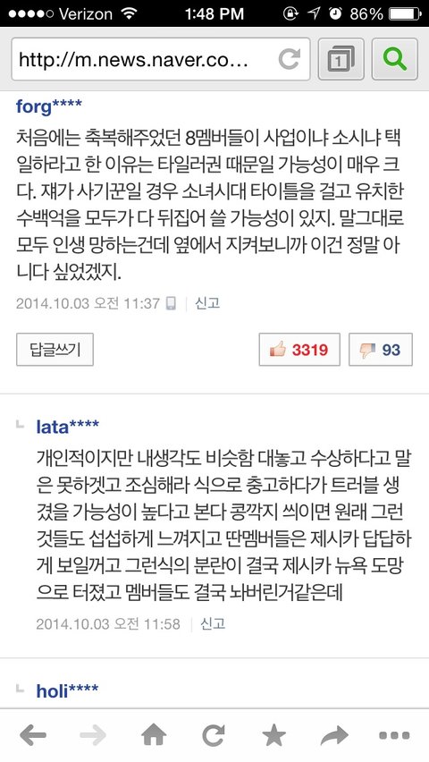안티들이 이때다 싶어서 소시까는거지만 누가 봐도 제시카 잘못... 8명이 제시카 버린게 아니고 제시카가 소녀시대를 버린 거겠지. 소시 나간다 했다가 변호사랑 얘기해보고 다시 한다고 하질 않나 (사업하는데 소시 이름 쓰려고) 사업한다고 바빠서 연습도 하지도 않고 스케줄 전날까지 남친이랑 뉴욕에 있다가 오고.. 그 전에도 제시카 우선순위가 소시가 아닌것 때문에 회의여니까 제시카는 회의 끝나고 결론 나오기도 전에 외국으로 가버리고 (자기 우선순위가 바껴서 위태로운 소시 지키려고 회의 연 멤버들은 뭐가됨..) sns에는 나머지 멤버들 샹년으로 만들고... 멤버들은 끝까지 말렸겠지 그러다가 도저히 안되니까 소녀시대 지키려고 어쩔 수 없이 선택을 요구한거고. 소시 눈물이 거짓이네 이런 말 나오는 것 조차 어이없다.