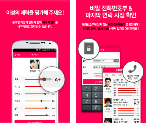 주요 기능은 1. 관심있는 이성들 과의 마지막 연락 시점을 체크, 2. 특이사항이나 약속 등을 기록하는 메모장 기능, 3. 매력 포인트별로 순위를 매길 수 있는 소소한 기능이 있어요~