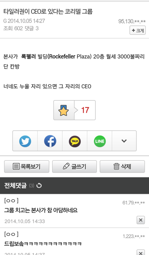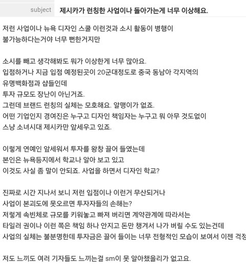 겨패션사업 이미 레드오션인거 같은데 경험도 없이 400억짜리로 시작하는 것 자체도 불안한데 이건 또 뭐야..... 멤버저격해서 친구들 자기도 징하게 당했을 악플 찌라시 구렁텅이로 몰아놓고 한다는 사업이 이 모양이니... 부질없다 진짜.... 이제 와 다시 소시로 돌아오는 것도 별로지만 그렇다고 망하지도 마... 69.78