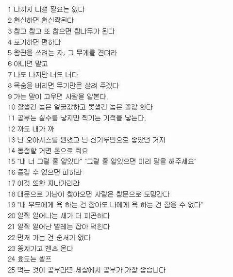 가는말이 고우면 사람을 얕본다가 제일 공감. 실실웃어대면 호구로 생각하고 앞에서 대놓고 까댐. 세계 3차대전 일어나서 그인간들 다죽었으면 좋겠음