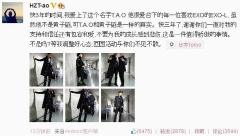 3년 다 되가는 시간 동안, 저는 이 T.A.O 라는 이름을 사랑하게 됐어요. 그는 무대 아래 EXO를 좋아하는 모든 EXO-L를 무척 사랑해요. 비록 그는 황쯔타오가 아니지만 T.A.O와 황쯔타오는 똑같이 진실합니다.