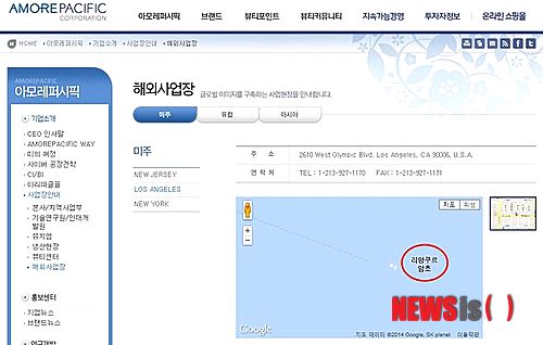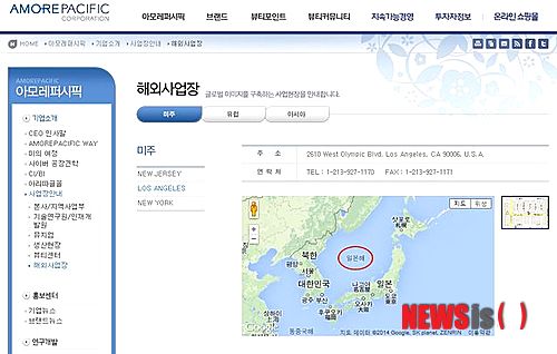 아모레퍼시픽(대표이사 서경배)은 7일 현재 인터넷 홈페이지를 통한 기업소개에서 해외사업장을 안내하면서 '동해'를 '일본해'로 표기한 구글지도 서비스를 그대로 따와 옮겨놓았다.