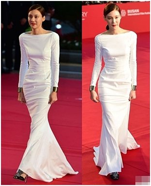 노출이 거의 없는 화이트 드레스에 골드 컬러의 두꺼운 뱅글,