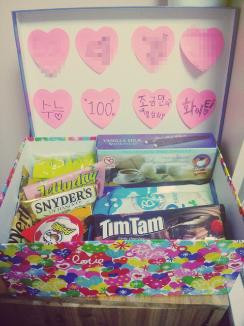 꽤 깊은 상자 색종이4개 찹쌀떡 두..열두개! 여러종류의 초콜릿(이라고 해봤자 가나랑 크런키 abc꼬마들2) 사탕2봉지