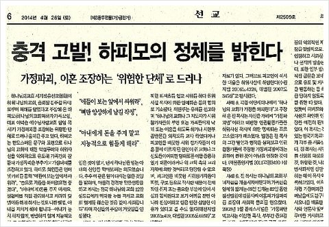" 충격 고발 하피모의 정체를 밝힌다 " 라는 제목으로 가정파괴 , 이혼 조장하는 위험한 단체로 들통난 하피모에 대해 기사가 실렸습니다.