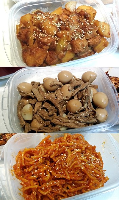 2. 오뎅감자볶음, 돼지고기 메추리알장조림, 오징어채무침, 견과류멸치볶음