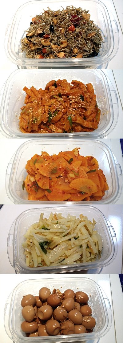 매운오뎅볶음, 단무지무침, 감자채볶음, 메추리알장조림