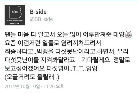 항상 믿을꺼고 가식이란 단어따위 빅뱅과 연관시키지 않을거임. 초심으로 나또한 돌아가서 얘들 더 성공할수 있도록 도와주려고..