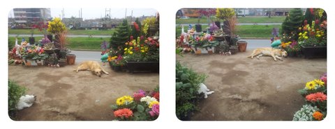 같은 꽃집 옆 가게, 견상과 돌아누워 잠자는 犬