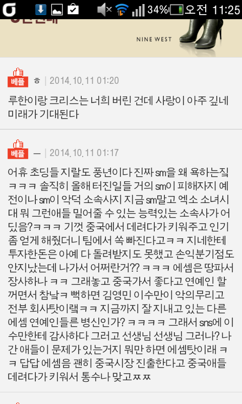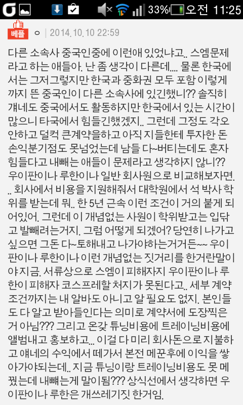 특히 일반사원이었으면 하고 생각하면 진짜ㅋㅋ 요즘같은 청년실업사태에 대기업 뽑아준것만해도 탱큥이지ㅋㅋ 연예인이라는 지위이용해서 이슈끌고 동정여론 만들어서 키워준 손 물고 같이 동고동락해온 멤버 물먹이고 돈도 ㅈㄴ많으면서 위약금 내기 싫어서 소송걸고 참 잘하는짓이다