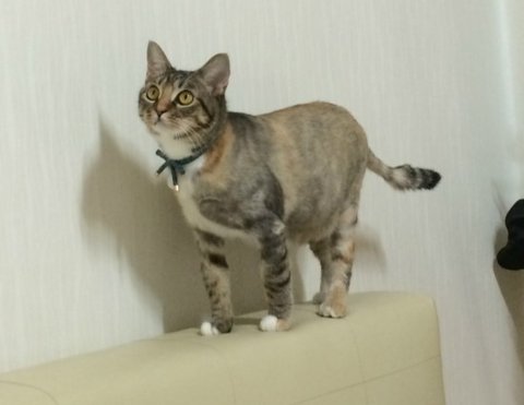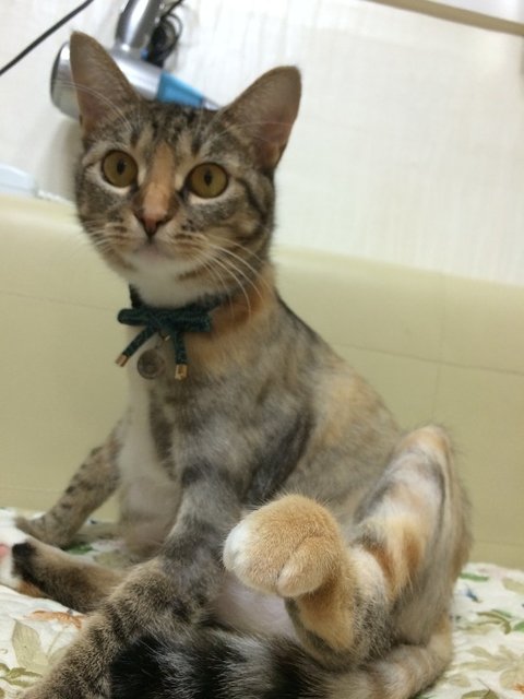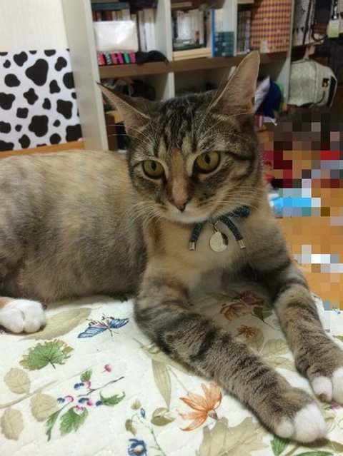 청록색 리본으로 된 목걸이 인식표를 하고 있으며 1살 가량 된 삼색고등어 여아입니다. 중성화 했습니다.