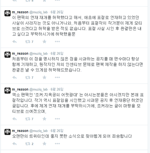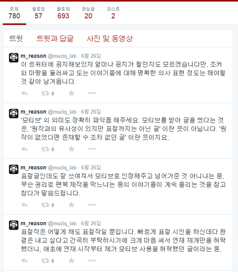 밑에서부터 봐야됨. 이거 원작자는 표.절이라고 생각한다는거 아님..?난 리1즌 트위터에 모티브 아니고 표절이라고 올라왔길래 그렇게 알고있었는데밑글 보니까 모티브라고 설정만 따온거라고 하는 감풍이들이 있길래..