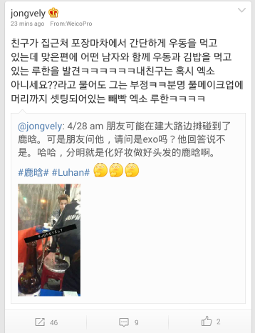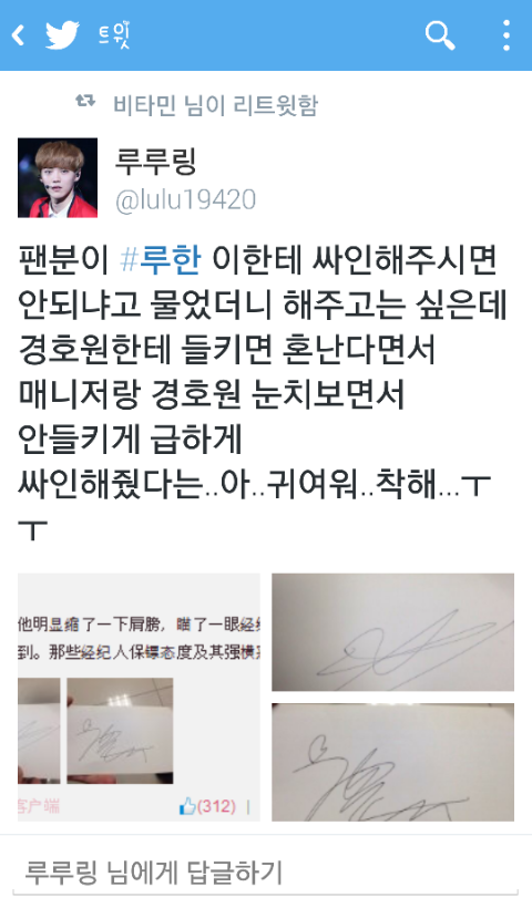 이사진은 트위터에서 퍼왔는데 루한한테 생일이라하니까 루한이 돌아서 생일축하한다고해줬데..부럽