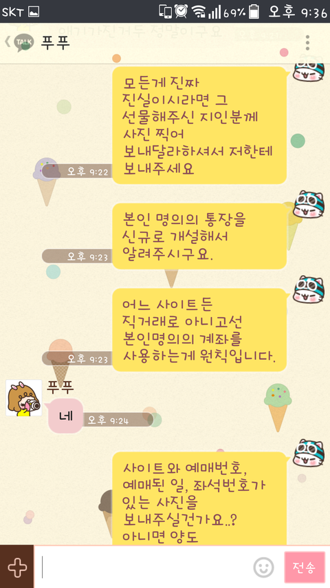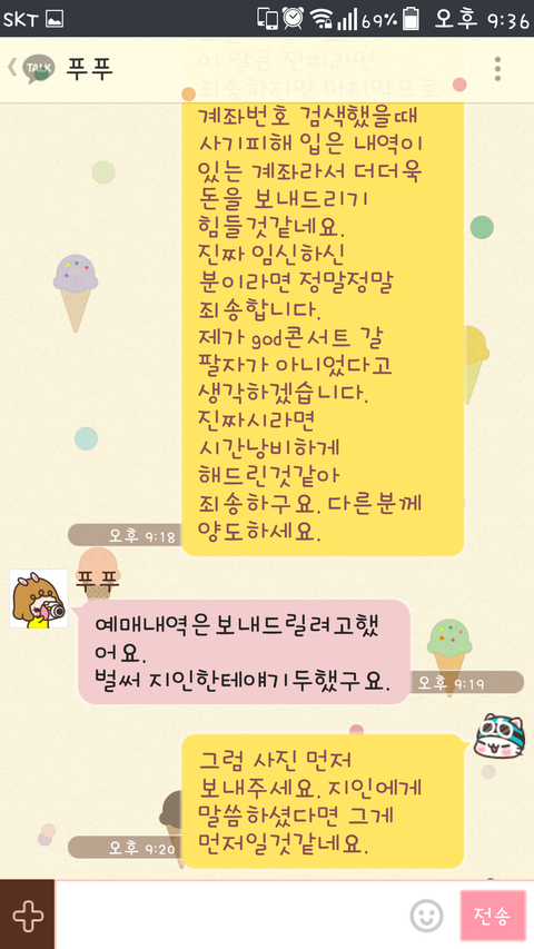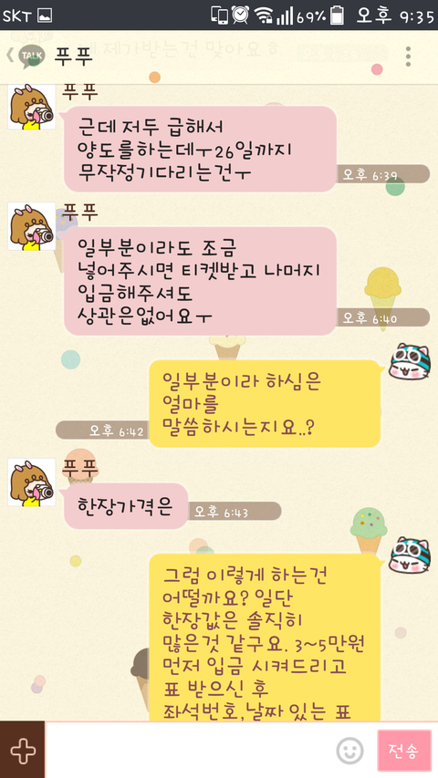 ② 티켓 실물이 있다면 직거래가 가장 좋습니다. 만약 직거래를 할 수 없다면 사전에 사진을 찍어 보내달라하고, 등기(일반우편X)로 보내달라하고 등기번호와 개인신상(연락처, 핸드폰번호,계좌번호)등을 서로 알아두시기 바랍니다.