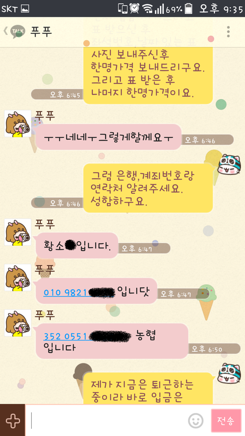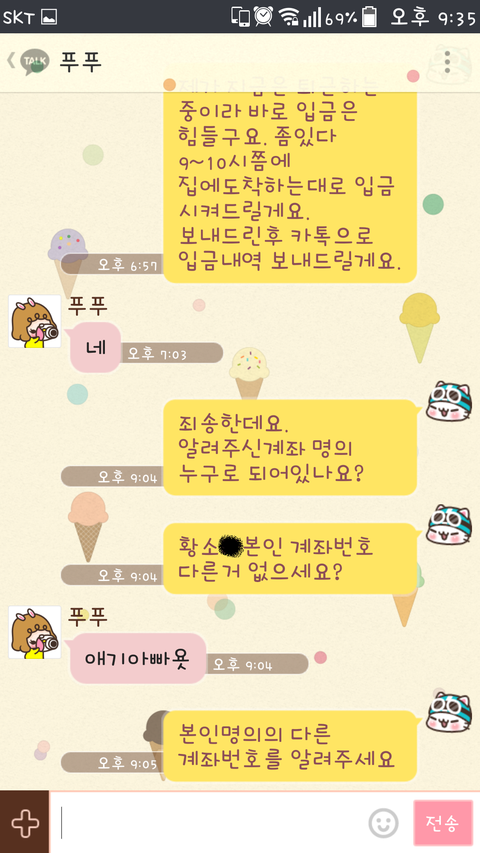 계좌이체시 상대방 본인의 명의로 되어있는지를 확인하시기 바랍니다. 간혹 저와같이 다른사람의 명의로 된 통장을 알려주는 분들은 의심해볼 필요가 있으니 입금하지 마시기 바랍니다.